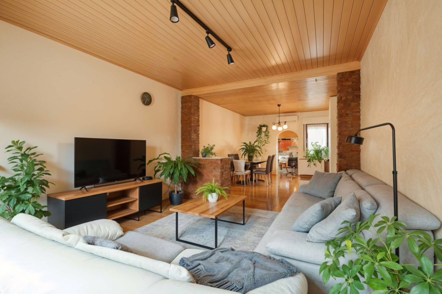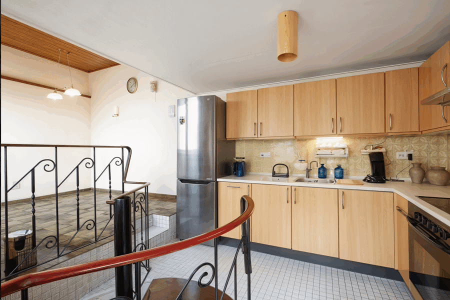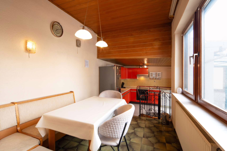 Die Wohnung überzeugt mit einem großzügigen, offenen Wohnbereich von etwa 32 m² – ideal für gesellige Stunden. Die angrenzende Küche mit Essecke im Anbau führt über eine Wendeltreppe in den Hobbyraum im Untergeschoss. Zwei weitere Zimmer und ein helles Badezimmer runden das Raumangebot ab. Die Einheit ist derzeit frei und bietet sofortige Nutzungsmöglichkeiten – sei es zur Eigennutzung oder Neuvermietung.