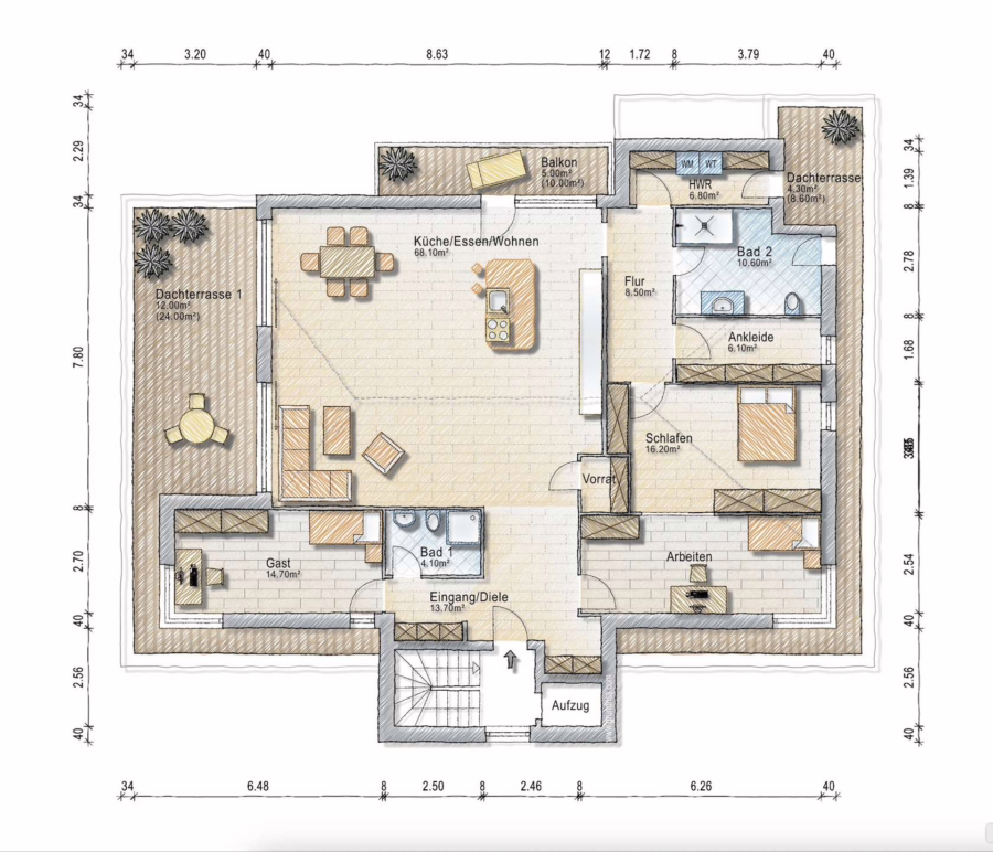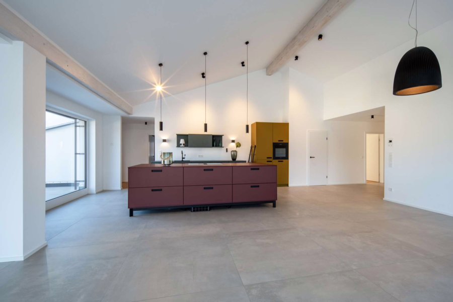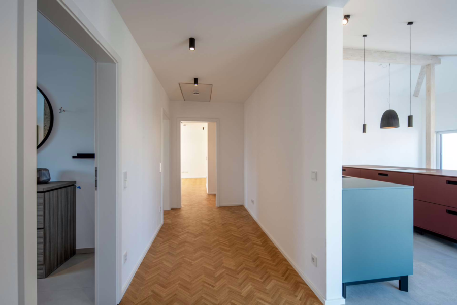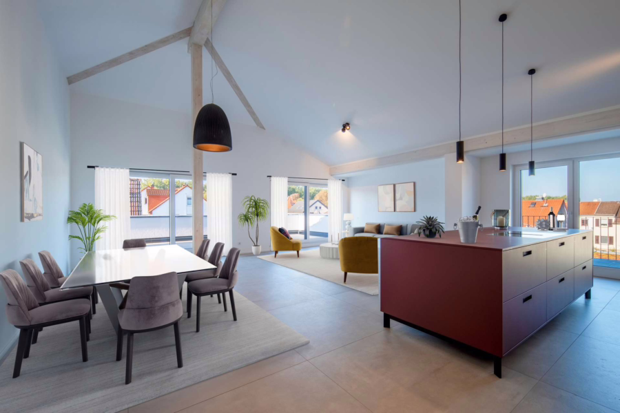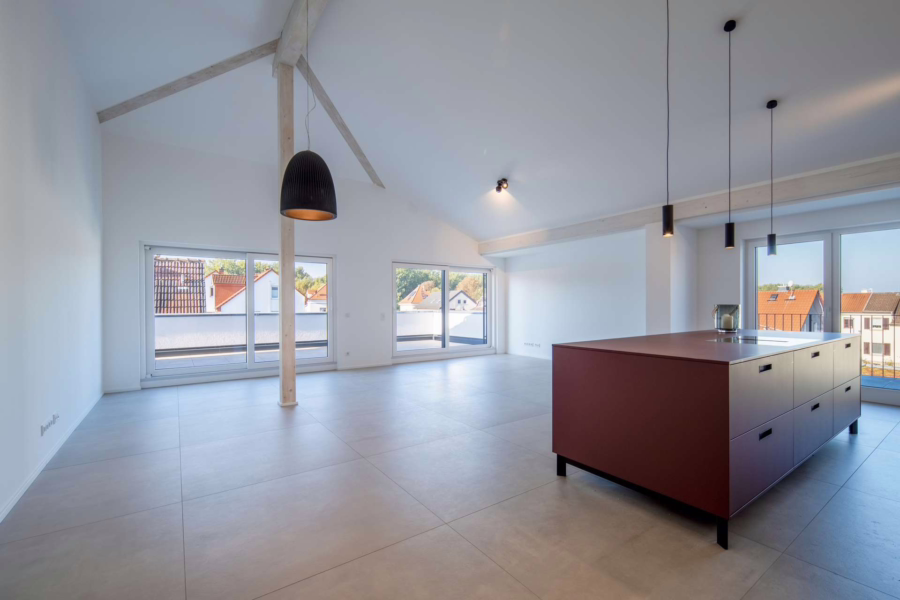 Ein echtes architektonisches Highlight ist der offene Dachstuhl mit sichtbaren Holzbalken, der dem ca. 70 m² großen Wohn- und Essbereich eine loftartige, luftige Atmosphäre verleiht und für ein außergewöhnliches Raumgefühl sorgt. Die zwei großzügigen Dachterrassen und der Balkon, die die Wohnräume ins Freie erweitern und ein Lebensgefühl von Freiheit und Offenheit vermitteln heben das Wohnerlebnis auf ein neues Niveau. Ob sonniges Frühstück mit Blick ins Grüne, ein Glas Wein bei Sonnenuntergang oder ein entspanntes Wochenende mit Freunden unter freiem Himmel – hier genießen Sie maximale Freiheit und Privatsphäre im Außenbereich.